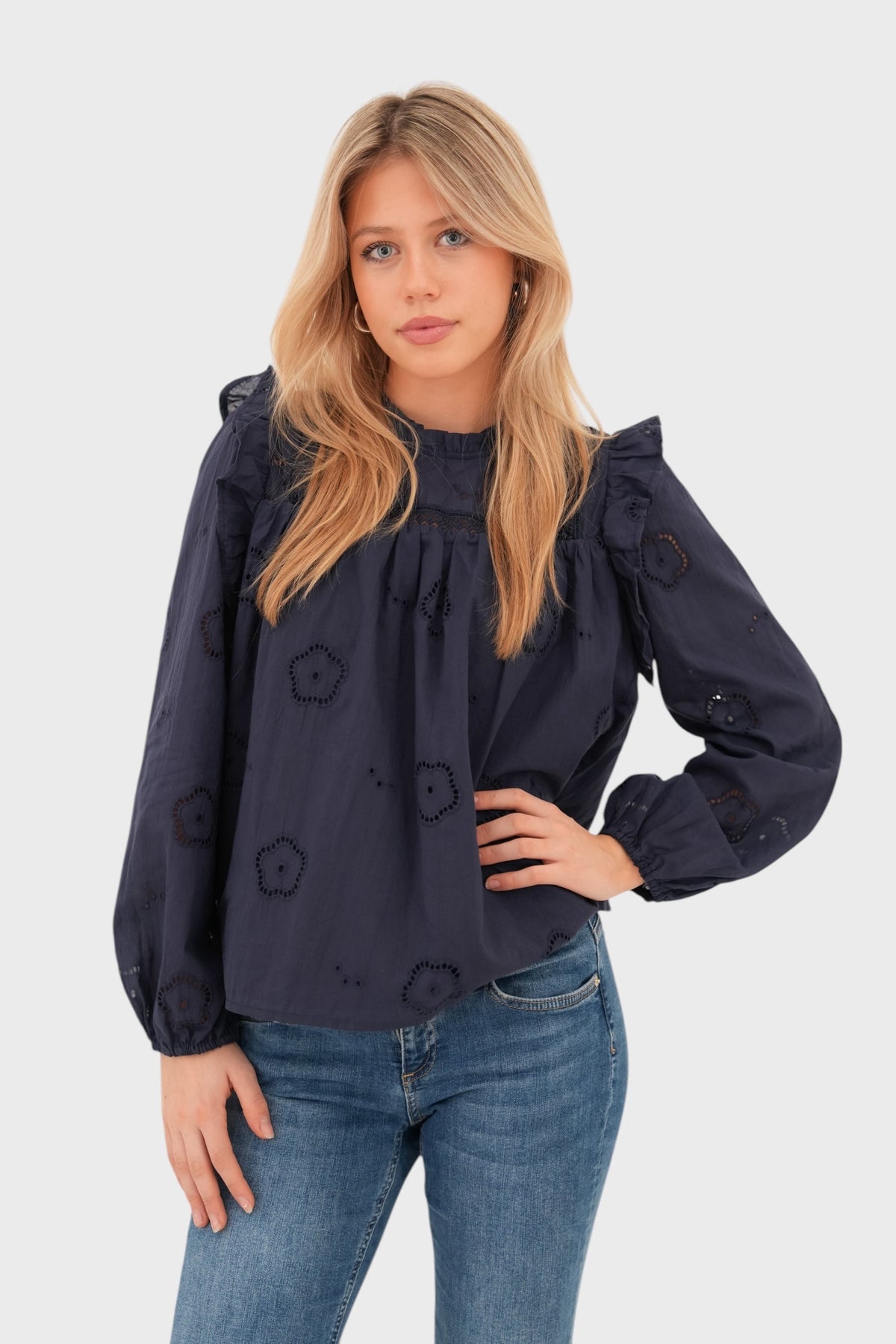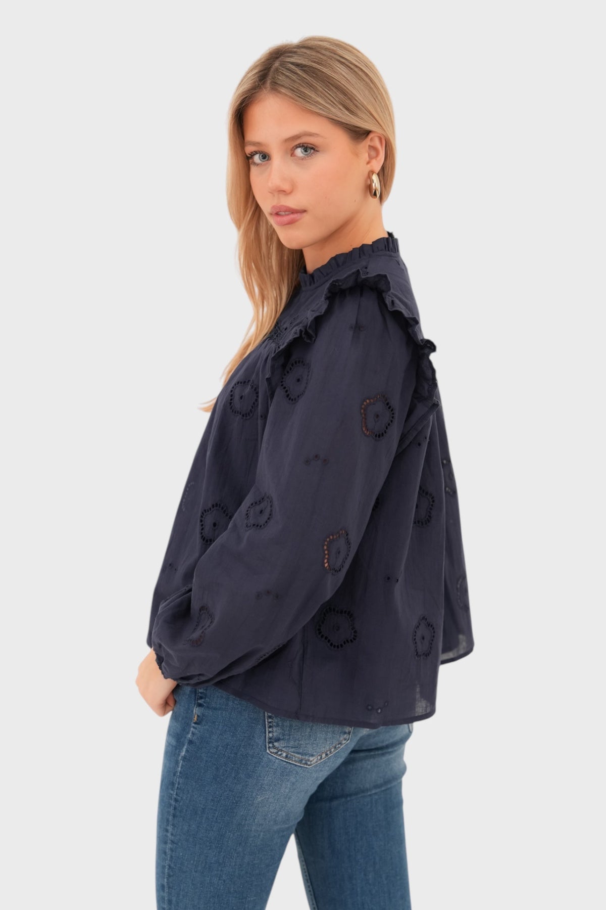 Stylowa bluzka w kolorze granatowym z haftowanymi detalami. Idealna na co dzień i na bardziej eleganckie stylizacje.