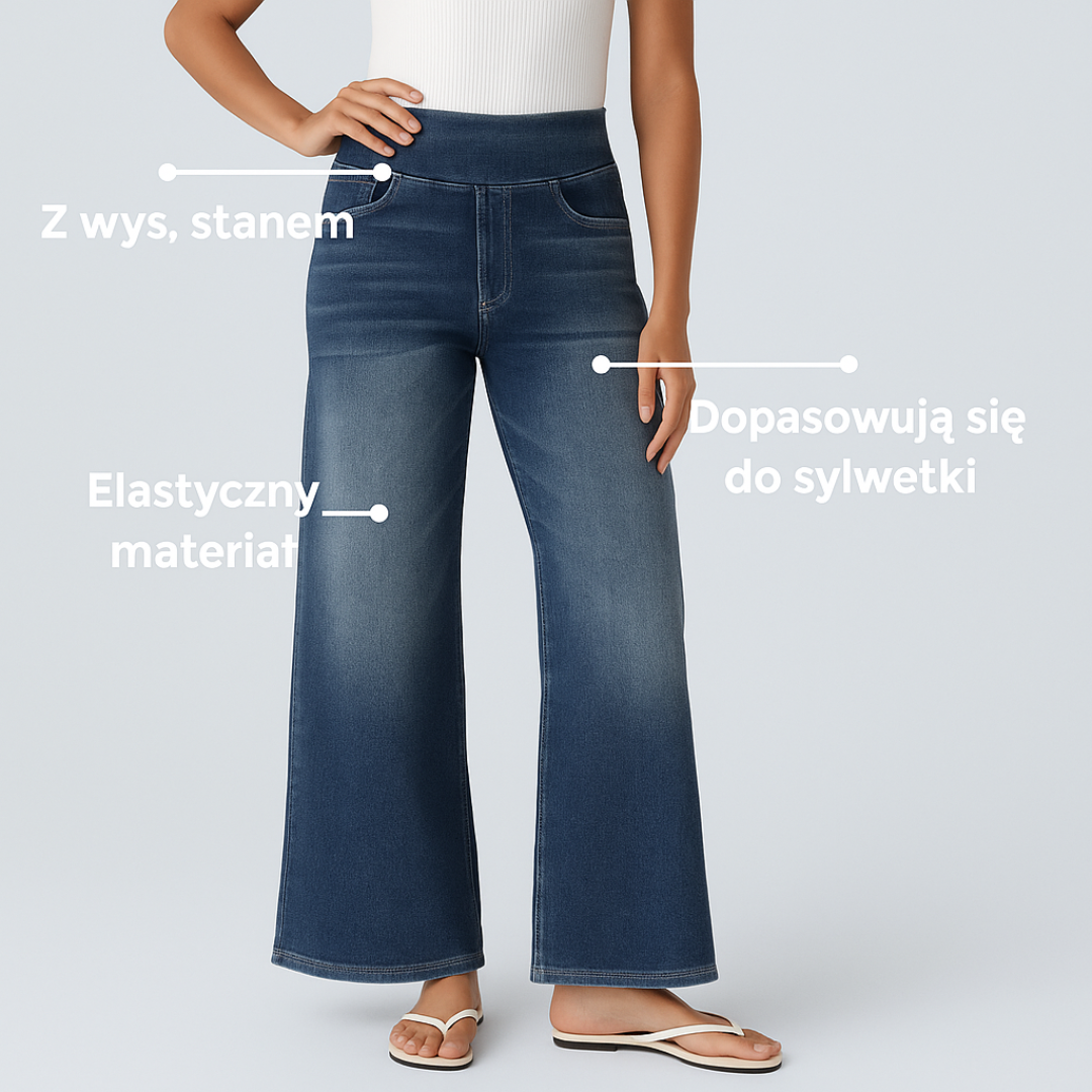 Elegancka, wysoka talia tworzy piękną linię sylwetki, optycznie wysmuklając i wydłużając nogi, przy zachowaniu pełnego komfortu.